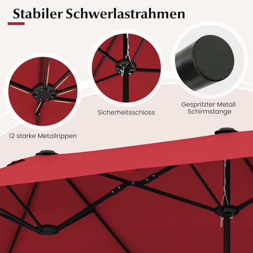 【Stabiler und winddichter Rahmen】Der Sonnenschirm besteht aus einem pulverbeschichteten, robusten Rahmen und zeichnet sich durch unerschütterliche Stabilität und Haltbarkeit aus. Außerdem verfügt der große doppelseitige Terrassenschirm über 12 stabile Rippen, die für optimale Windfestigkeit sorgen.