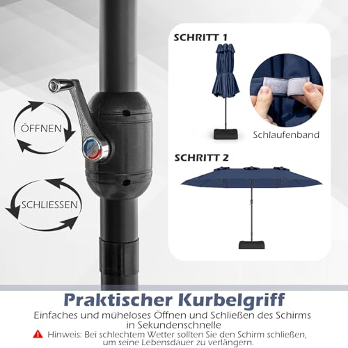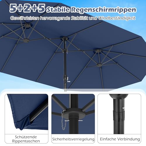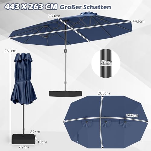 【Großer Schattenbereich】Mit großzügigen Abmessungen von 443 x 263 x 261 cm (L x B x H) bietet der große doppelseitige Terrassenschirm umfassenden Abschirmung für Ihre Zusammenkünfte und Aktivitäten im Freien. Mit einem Schirmmast mit 48 mm Durchmesser ist er perfekt für die Kombination mit Esstischen im Freien im Rahmen.