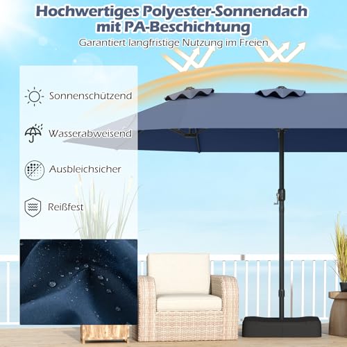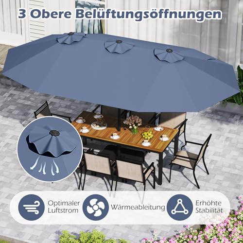 Unser doppelseitiger Terrassenschirm mit den Maßen 443 x 263 cm bietet einzig in Hülle und Fülle Schatten und eignet sich ideal für eine Mannigfaltigkeit von Anlässen, von einem lebhaften Grillabend im Garten bis hin zum ruhigen Entspannen am Pool. Er verfügt über einen beschwerten Sockel mit 2 Sandsäcken, die bis zu 58 kg Sand absorbieren können, ergänzt durch 12 stabile Schirmstreben aus Metall und einen Sicherheitsriegel, die einen sicheren und stabilen Aufbau bei leichtem Wind gewährleisten, während 3 Belüftungsöffnungen an der Oberseite die Gesamtstabilität weiter umschreiben und die Belüftung in Gefahr geraten.