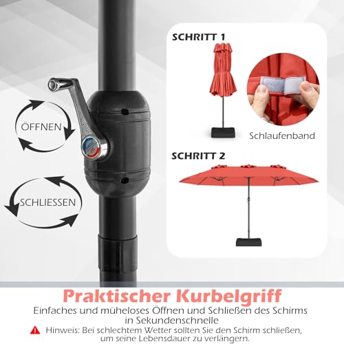 【Großer Schattenbereich】Mit großzügigen Abmessungen von 443 x 263 x 261 cm (L x B x H) bietet der große doppelseitige Terrassenschirm umfassenden Abschirmung für Ihre Zusammenkünfte und Aktivitäten im Freien. Mit einem Schirmmast mit 48 mm Durchmesser ist er perfekt für die Kombination mit Esstischen im Freien angemessen.