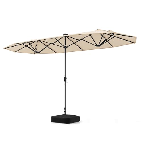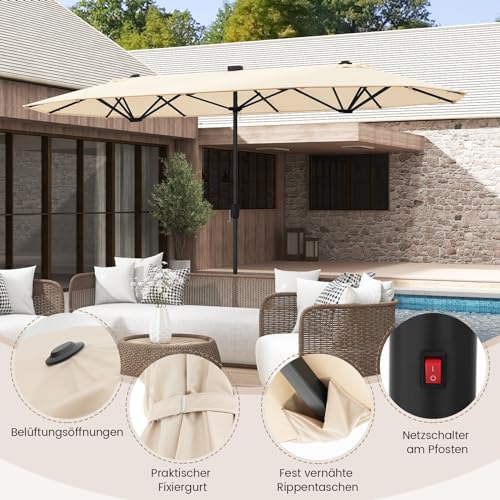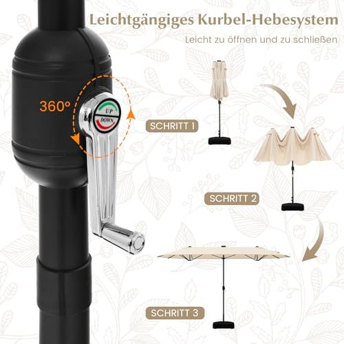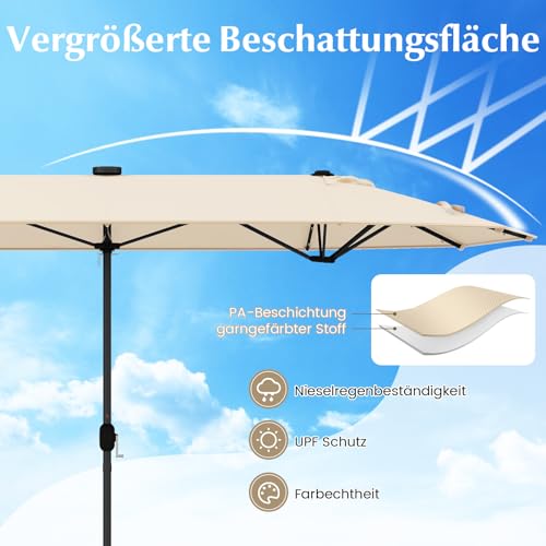 【Erweiterte Fläche und breite Nutzung】Mit einer großen Abdeckfläche von 400 x 200 cm verspricht der doppelseitige Sonnenschirm, Ihre größeren Versammlungen problemlos zu schützen. Und das Schirmdach ist mit Lüftungsschlitzen ausgestattet, um eine kühle Oase in Ihrem Garten, Ihrer Terrasse oder am Pool zu kultivieren.
