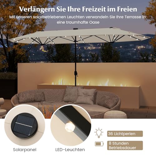 【Bietet eine großzügige Abendbeleuchtung】Ausgestattet mit 36 LED-Lichtern können Sie Tag und Nacht seine natürliche Schönheit genießen. Sobald Sie den Netzschalter an der Stange drücken, kann der extragroße Terrassenschirm nach Abenddämmerung bis zu 8 Stunden lang glamouröses Licht spenden und so eine herrliche Stimmung statt dessen Ihre abendliche Genuss kultivieren.