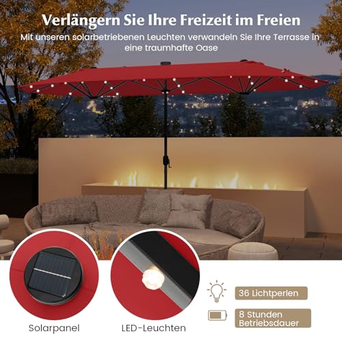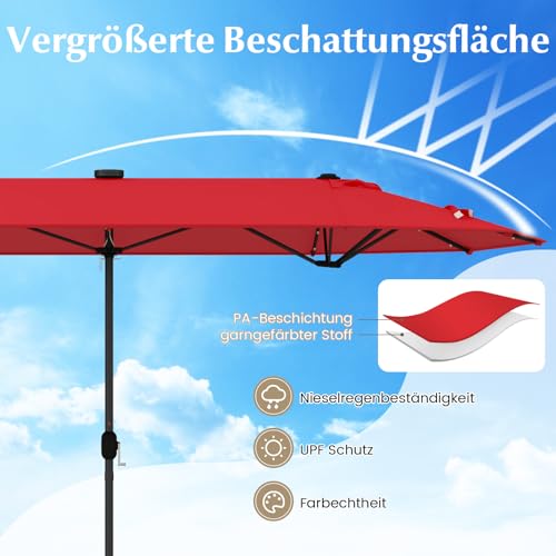 【Erweiterte Fläche und breite Nutzung】Mit einer großen Abdeckfläche von 400 x 200 cm verspricht der doppelseitige Sonnenschirm, Ihre größeren Versammlungen problemlos zu schützen. Und das Schirmdach ist mit Lüftungsschlitzen ausgestattet, um eine kühle Oase in Ihrem Garten, Ihrer Terrasse oder am Pool zu schuften.