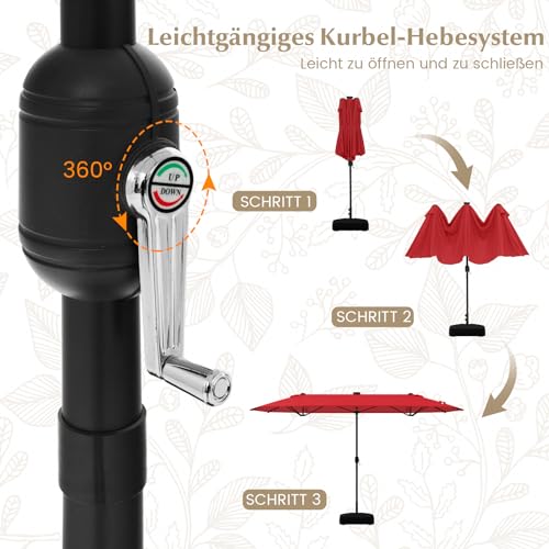 【Einfacher Aufbau und einzig gewichtete Basis】Dank des Kurbelsystems lässt sich der Terrassenschirm schnell anbrechen und kombinieren. Darüber hinaus gibt es eine einfach aufzubauende Kreuzbasis, die mit 60 kg Sand beschwert werden kann, um eine hervorragende Windbeständigkeit zu gewährleisten. Wenn der Doppelsonnenschirm geschlossen ist, kann er mit einem Riemen gesichert werden, um ihn einfach zu verstauen.