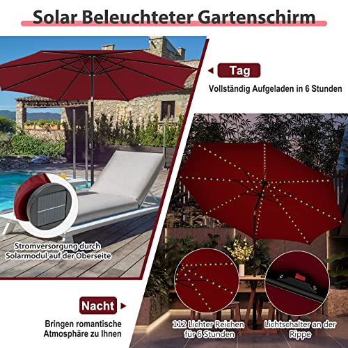 Unser solarbetriebener Sonnenschirm misst 300 x 258 cm (Durchmesser x H) und bietet einen großen Schattenbereich für Ihre Outdoor-Aktivitäten. Und Sie können ihn in den Außentisch angleichen, sodass Sie die Freizeit mit Freunden oder der Familie im schönen Garten, auf der Terrasse, am Pool usw. genießen können. Es gibt 112 solarbetriebene LED-Leuchten an den Rippen und ein Solarpanel an der Oberseite, die nicht wohl eine warme und romantische Atmosphäre für Ihre Sommernächte rödeln, sondern auch Energie sparen können. Außerdem lässt sich der Neigungswinkel des Schirms verstellen, um sich an den wechselnden Sonnenstand anzupassen. Sie können ihn einfach mit der praktischen Kurbel zum Heben öffnen oder induzieren, und der Schlaufenriemen am Dach hilft, den Sonnenschirm zu stützen, wenn er nicht verwendet wird, um ihn kompakt zu verstauen.