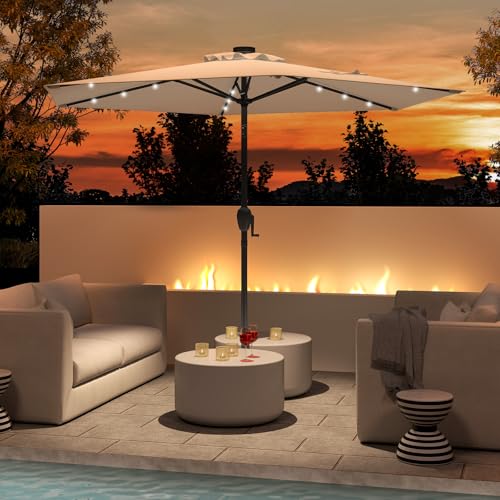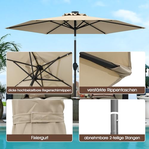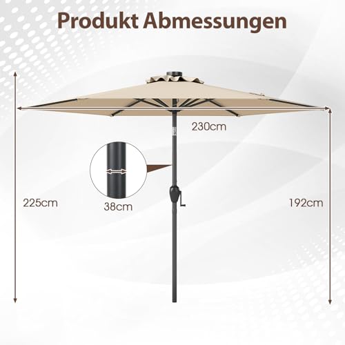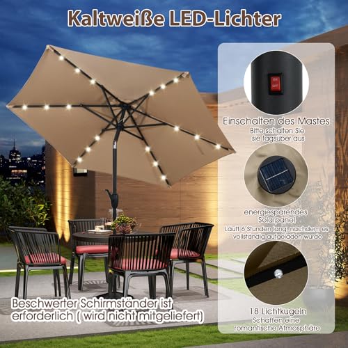 【Energiesparendes Beleuchtungssystem】Mit 18 LED-Leuchten an den Schirmstreben sorgt der Gartenschirm für einladendes Licht an Ihren Abenden. Das Solarpanel spendet nach vollständiger Aufladung bis zu 6 Stunden Licht. Für eine längere Nutzungsdauer schalten Sie die Beleuchtung tagsüber bitte aus.