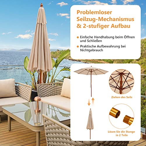 【Problemloser Seilzugmechanismus】Der Marktschirm verfügt über einen Seilzugmechanismus, mit dem Sie den Sonnenschirm mühelos öffnen oder Abstrahieren können, indem Sie am Seil ziehen. Und die Holzstange kann zur bequemen Aufbewahrung bei Nichtgebrauch einfach in 2 Teile zerlegt werden.