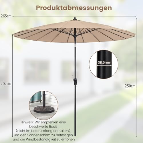 【Breites Anwendungsspektrum】Dank des leichten Designs eignet sich der einfach aufzustellende Sonnenschirm für verschiedene Orte, darunter Garten, Poolbereich, Hinterhof und Strand. Er kann sogar mit einem Esstisch im Freien kombiniert werden, um die Freizeit mit Ihrer Familie oder Freunden zu genießen (Durchmesser der Stange: 38,5 mm).