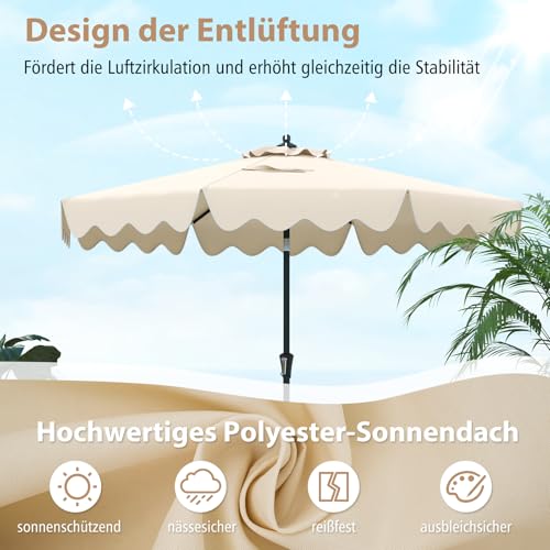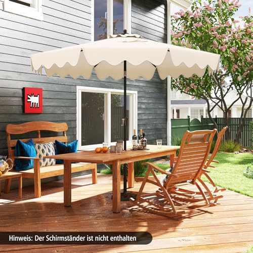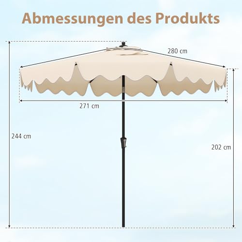 【Elegantes und modisches Erscheinungsbild】Dieser Sonnenschirm misst 271 x 244 cm (Durchmesser x Höhe) und bietet Ihnen und Ihren Lieben im Überfluss Schatten zum Entspannen im Freien. Er besticht durch die dekorativen gerüschten Kanten, die ihm einen Hauch von Eleganz verleihen. Zu guter Letzt ist er mit Klettverschlüssen zum Katalysieren von Dekorationen ausgestattet.
