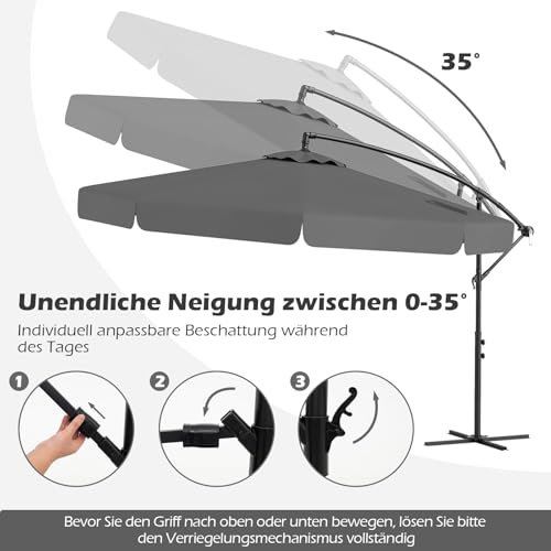 Unser 300 cm langer Ampelschirm ist eine perfekte Beschattung für Ihre Terrassen, Gärten, Poolbereiche, Veranstaltungen im Freien oder sogar gewerbliche Bereiche und bietet großzügigen Schatten für verschiedene Outdoor-Aktivitäten. Er enthält eine Schutzhülle, die sicherstellt, dass Ihr Schirm bei Nichtgebrauch geschützt bleibt, was seine Lebensdauer verlängert. Die benutzerfreundliche Kurbel sorgt für eine reibungslose Bedienung und macht das Öffnen und Verallgemeinern zu einem Kinderspiel. Dieser aus einem Polyesterdach mit belüfteter Oberseite gefertigte Ampelschirm bietet nicht dennoch hervorragenden Abschirmung vor den Elementen im Freien, sondern verbessert auch die Luftzirkulation für größtmögliche Entspannung. Außerdem können Sie Ihren Schatten den ganzen Tag über mit unserem flexiblen Dach auf dieselbe Ebene stellen, das sich zwischen 0 und 35 Tönung neigen lässt. Unser vielseitiger Outdoor-Schirm mit gerüschten Rändern ergänzt jede Umgebung im Freien, von entspannten Tagen auf der Terrasse bis hin zu lebhaften Gartentreffen.