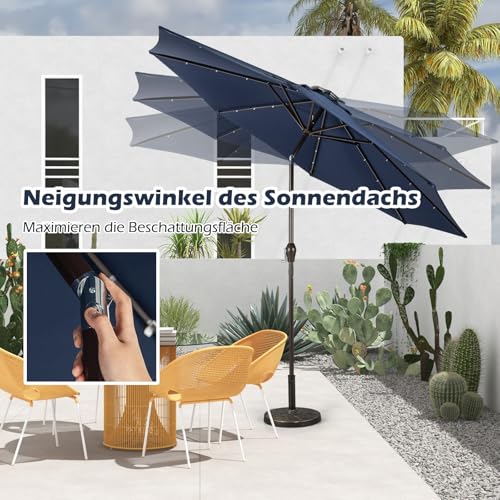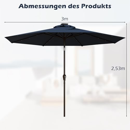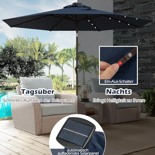 【Integrierte LED-Lichter】Dieser Schirm verfügt über 24 integrierte LED-Lichter an den Rippen, die es Ihnen ermöglichen, Ihren Außenbereich zu beleuchten und eine warme, einladende Atmosphäre zu schuften. Zudem wird er von Solarpanels betrieben, was ihn zu einer energieeffizienten und umweltfreundlichen Beleuchtungslösung macht.