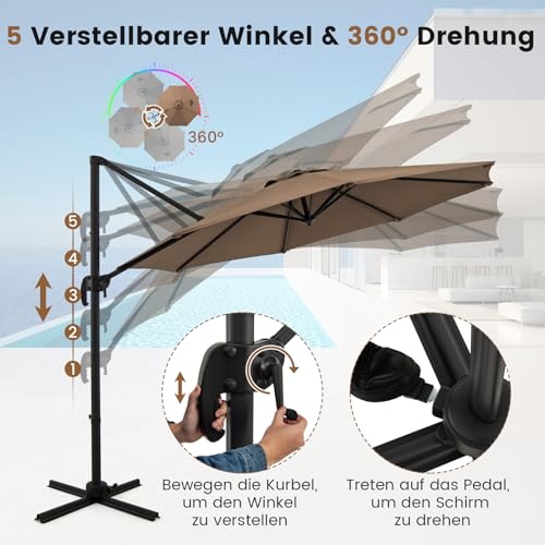 【Einstellbare Neigung und 360°-Drehung】Der Ampelschirm stellt fünf einstellbare Neigungswinkel zur Verfügung, die sich einfach durch Bewegen der Kurbel nach oben und unten einstellen lassen. Ein praktisches Fußpedal ermöglicht eine nahtlose 360°-Drehung.