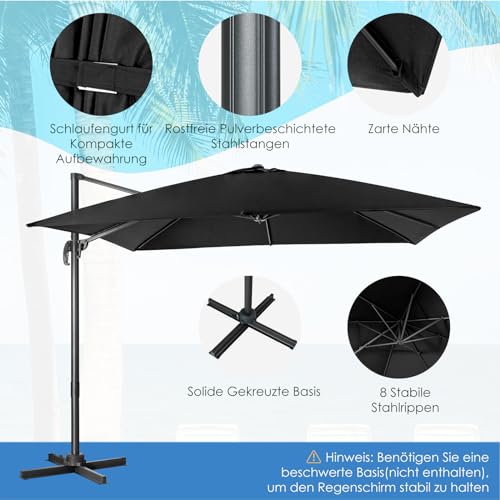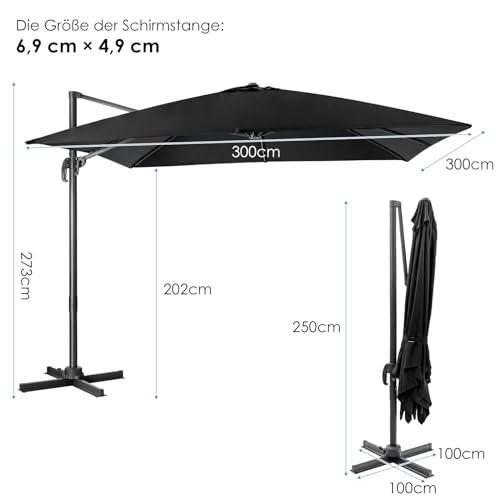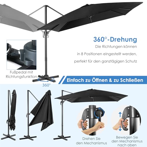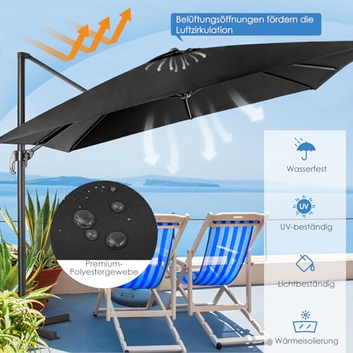 COSTWAY Sonnenschirm 300 x 300 cm quadratisch, Ampelschirm mit Kurbel, Gartenschirm neigbar, 360° drehbar, großer Terrassenschirm, Marktschirm für Gärten, Terrassen, Cafés, Schwarz