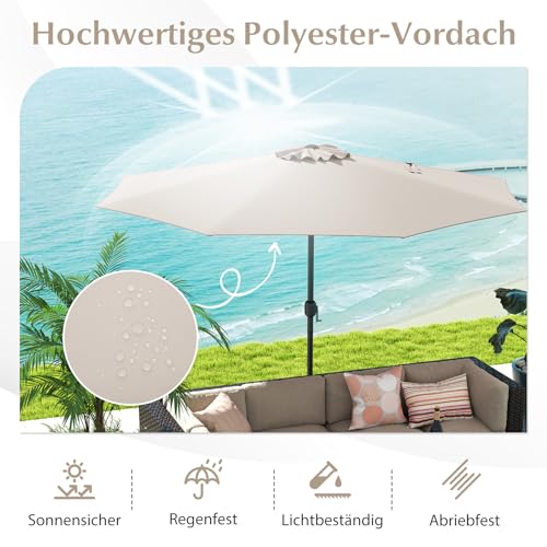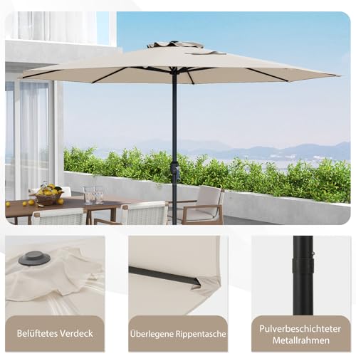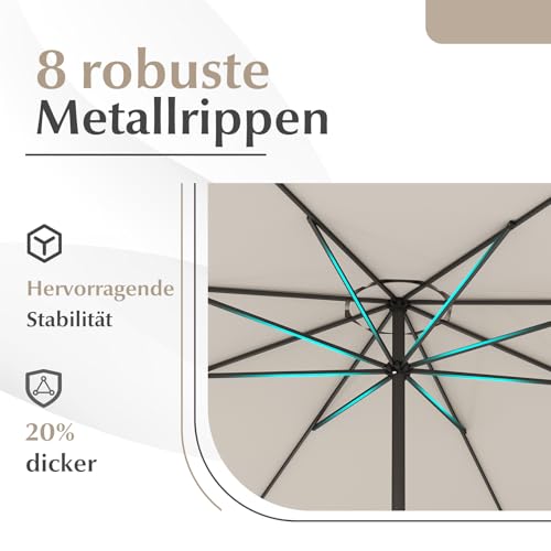 【Stabile Konstruktion】Der belüftete Sonnenschirm ist aus pulverbeschichteten Metallrohren gefertigt und mit 8 hochbelastbaren Streben verstärkt. Er bietet zuverlässigen Halt und Haltbarkeit und ist somit ideal für windige Umgebungen. Hinweis: Für zusätzliche Stabilität ist ein beschwerter Sockel (nicht im Lieferumfang enthalten) erforderlich.