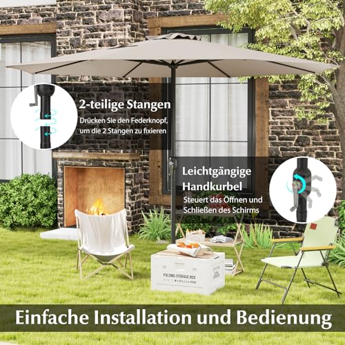 【Einfache Installation und Bedienung】Der Terrassenschirm verfügt über eine praktische Kurbel, die ein einfaches Öffnen und Suffigieren mit minimalem Ertrag gewährleistet. Nach dem Gebrauch kann der Schirm bei Nichtgebrauch mühelos in zwei Teile zerlegt werden, was eine kompakte Lagerung ermöglicht.