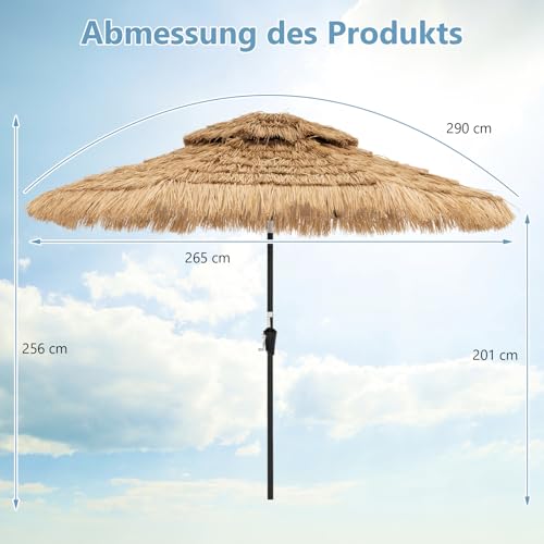 【Vielfältige Anwendungsmöglichkeiten und Abmessungen】Dieser tragbare Terrassenschirm eignet sich für verschiedene Szenarien. Er ist perfekt für ein Grillfest im Garten, einen Tag am Strand oder eine Veranstaltung mit tropischem Thema. Die Gesamtmaße betragen 265 x 256 cm (Durchmesser x Höhe) und die Schirmkante ist 201 cm vom Boden entfernt.