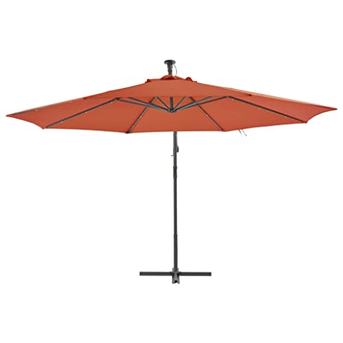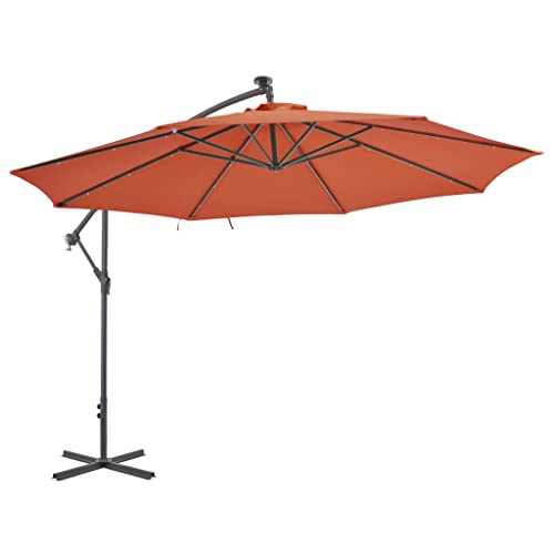 Home Products Freischwinger-Regenschirm mit Aluminiumstange, 350 cm, Terrakotta. Dieser elegante Sonnenschirm zum Aufhängen ist perfekt, um Schatten zu buckeln und Sie vor den schädlichen UV-Strahlen der Sonne zu schützen. Jedweder UV-Abschirmung- und lichtechtem Polyester gefertigt, bietet Ihnen die Sonnenschirmhülle optimalen Abschirmung vor der Sonne und ist leicht zu reinigen. Es verfügt über einen stabilen Kreuzsockel für mehr Stabilität. Das exklusive Design dieses Sonnenschirms ermöglicht es Ihnen, den Sonnenschirm zu neigen, um die Sonne zu blockieren, weil er in Richtung des Horizont geht. Die starke Metallstange zusammen mit den 8 robusten Rippen macht den Sonnenschirm äußerst sicher und langlebig. Unser Gartenschirm lässt sich dank des Kurbelmechanismus einfach öffnen und umleiten. Der Bericht ist einfach zu montieren. Bitte schätzen Sie, dass wir empfehlen, den Schirmstoff mit einem Imprägnierspray zu texten, wenn er starken Niederschlägen ausgesetzt ist.