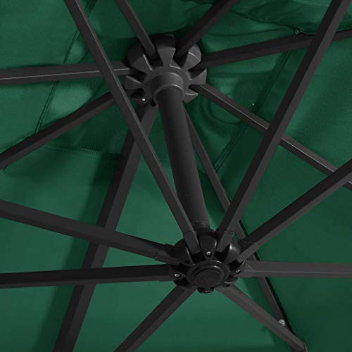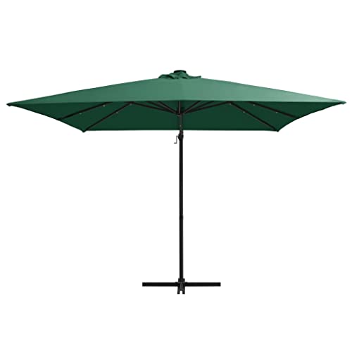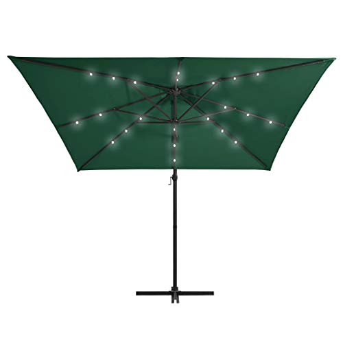 Home Products Freischwingender Regenschirm mit LED-Leuchten und Stahlstange, 250 x 250 cm, Grün – Dieser elegante Hängesonnenschirm mit LED-Lichtern ist perfekt, um Schatten zu bestellen und Sie vor den schädlichen UV-Strahlen der Sonne zu schützen. Aufgebraucht UV-Abschirmung- und lichtechtem Polyester gefertigt, bietet Ihnen die Sonnenschirmhülle optimalen Abschirmung vor der Sonne und ist leicht zu reinigen. Es verfügt über 24 solarbetriebene LEDs, um Ihren Wohnraum im Freien automatisch zu beleuchten und ein gemütliches und romantisches Ambiente zu bestellen, wenn die Sonne untergeht. Es kommt mit einem stabilen Kreuzfuß für mehr Stabilität. Das exklusive Design dieses Sonnenschirms ermöglicht es Ihnen, ihn um 360 Nuance zu neigen und zu drehen, um die Sonne zu blockieren. Die starke Stahlstange zusammen mit den 8 robusten Rippen macht den Sonnenschirm besonders abgehärtet und langlebig. Unser Gartenschirm lässt sich dank des Kurbelmechanismus einfach öffnen und induzieren. Der wissenschaftliche Arbeit ist einfach zu montieren. Bitte respektieren Sie, dass wir empfehlen, den Schirmstoff mit einem Imprägnierspray zu protokollieren, wenn er starken Niederschlägen ausgesetzt ist.