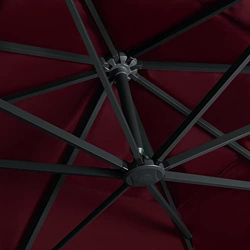 Home Products Freischwinger-Regenschirm mit LED-Lichtern, Bordeauxrot, 400 x 300 cm. Dieser elegante Sonnenschirm zum Aufhängen ist perfekt, um Schatten zu wirken und Sie vor den schädlichen UV-Strahlen der Sonne zu schützen. Aus UV-Abschirmung- und lichtechtem Polyester gefertigt, bietet Ihnen die Sonnenschirmhülle optimalen Abschirmung vor der Sonne und ist leicht zu reinigen. Es verfügt über 24 solarbetriebene LEDs, um Ihren Wohnraum im Freien automatisch zu beleuchten und ein gemütliches und romantisches Ambiente zu wirken, wenn die Sonne untergeht. Es kommt mit einem stabilen Kreuzfuß für mehr Stabilität. Dieser Gartenschirm lässt sich einfach durch einfaches Drehen des Knopfes an der Stange öffnen und abstrahieren. Der Winkel der Hülle kann durch Drücken und Ziehen des Griffs nach oben und nieder eingestellt werden. Der Mittelstock kann mittels Pedale bekannt als um 360 Tönung gedreht werden. Die starke pulverbeschichtete Aluminiumstange und die 8 robusten Rippen machen diesen Sonnenschirm sehr sicher und langlebig. Bitte ästimieren Sie, dass wir empfehlen, den Schirmstoff mit einem Imprägnierspray zu verfassen, wenn er starken Niederschlägen ausgesetzt ist.