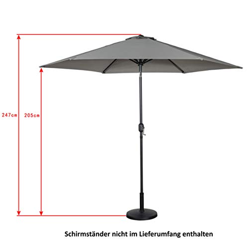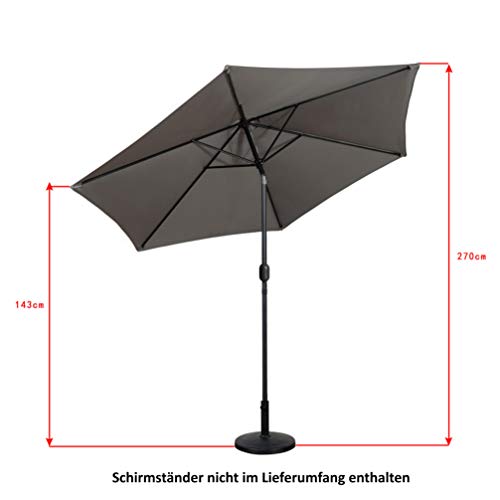 Technische Daten: Durchmesser 300 cm – Schirmhöhe 247 cm – 270 cm (bei Tendenz) – Durchmesser Standrohr 38mm – Material Mast: Aluminium – Material Bezugstoff: 100% Polyester(180g/m²) – Farbe: Sand