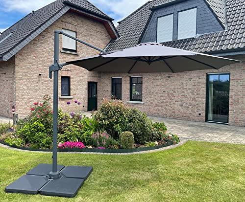 Der Alu Ampelschirm 300cm rund mit Kurbel FlLORENZ Grau 529810 von Deuline hat alles: hochwertige Materialien, intelligente Technik, modernes Design und zuverlässige Bildnis. Ihre Vorteile: UV-Abschirmung 50+ für sorgenfrei relaxen einteilige ovales Alu Mast mit den Maßen von ca. 50x71cm sorgt für Stabilität und Ästhetik 4-stufige Neigungswinkelverstellung entlang des Mastes um bis zu 80Degree 360Degree drehbar dank des massiven Drehgelenks aus Stahl mit Fußpedal leichtgängigen Kurbelmechanismus mit Magnetische Kurbel lässt sich der Sonnenschirm kinderleicht zu bedienen 8 verstärkte Streben versprechen für Stabile und Langlebigkeit Schirmtuch abnehmbar und tauschbar Schirmkrone mit integriertem Zwischenteil für LED Lampe Zackenkronenkranz aus Aluminium ist beständig und strapazierfähig Air-Vent Lüftungsöffnung verhindert Wärmestau im Schirm und sorgt für angenehme Klima Mit Halteband zum kompakten Verschnüren Alle Nieten und Ständerbefestigungschrauben sind aus rostfreiem Edelstahl Technische Details: Farbe: Grau Schirmform: rund Maße Schirmtuch: 300cm Material Schirmtuch: 100% Polyester 200g/m² Schirmhöhe: 248 -383cm Maße Mast: 50 x 71 mm Oval Material Mast: pulverbeschichtete Aluminium Anzahl Streben: 8 Material Streben: pulverbeschichtete Stahl Maße Schirmstangen: 23 x 14mm UV-Abschirmung: 50+ Lieferumfang: 1x Alu-Ampelschirm 300cm rund mit Kurbel FlLORENZ Grau 529810 mit Ständer Sie erhalten zu diesem Schirm einen Kreuzplattenständer. Damit der Schirm leistungsfähig steht, muss der Schirmständer mit Gewichten gesichert werden. Die Gewichte sind nicht im Lieferumfang enthalten.