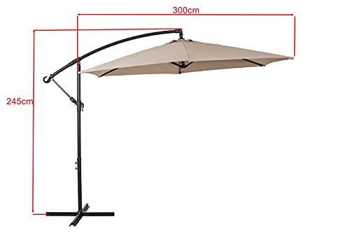 Technische Daten: Durchmesser 300 cm – Schirmhöhe 245 cm – Durchmesser Standrohr 48mm – Material Mast: Aluminium – Material Bezugstoff: 100% Polyester (180g / m2) – Farbe: Sand