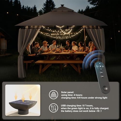 ✅【Pavillon mit LED-Leuchten】 Unterstützt Solarenergie und USB-Laden, um die Bequemlichkeit des Aufladens im Freien zu gewährleisten. Es ist auch mit einem zentralen Scheinwerfer und vier Lichtperlen auf jeder der acht oberen Röhren ausgestattet. Die Fernbedienung enthält einen 2-Tasten-Schalter, einen zweistufigen Timer für 30 Minuten und 60 Minuten, eine 5-stufige Hell-Dunkel-Annullierung und eine Betriebszeit von bis zu 4 Stunden, so dass die Nacht im Freien immer noch so hell wie der Tag ist.