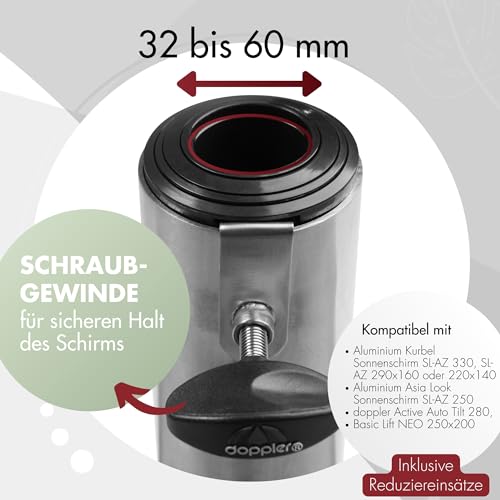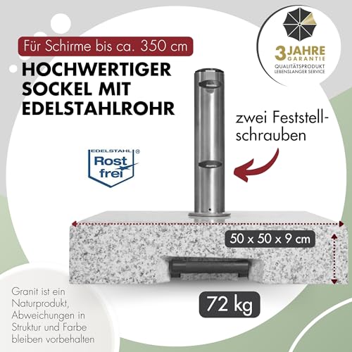 KOMPATIBEL – Der 72kg Sockel eignet sich anstatt aufgebraucht Gartenschirme mit einem Schirmdach-Durchmesser von max. 550cm & einem Rohrdurchmesser von 3,2-6,0cm. Der bevorzugte Lösungsweg passt er zu den doppler SL-AZ Sonnenschirmen.