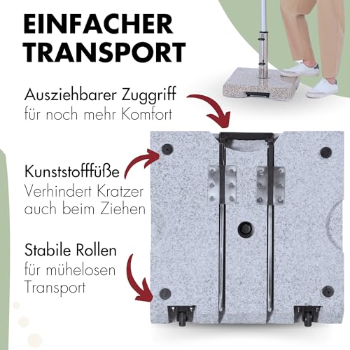 HOCHWERTIG & PRAKTISCH – Mit 2 Rollen & dem ausziehbaren Trolley-Knauf ausgestattet ist der Sockel einfach zu transportieren. Der hellgraue Granitstein bringt eine hochwertige Optik auf Ihre Terrasse!