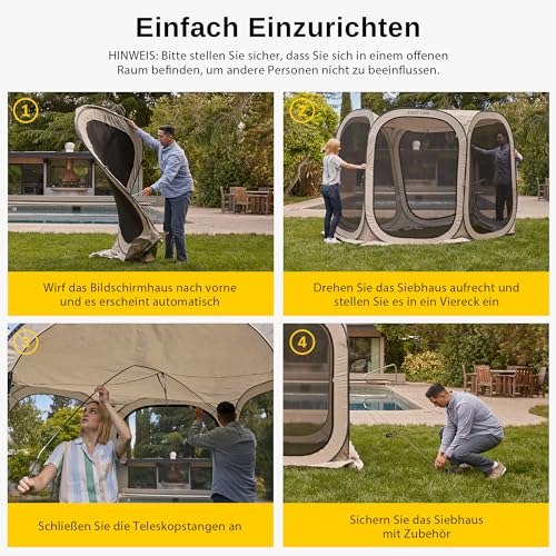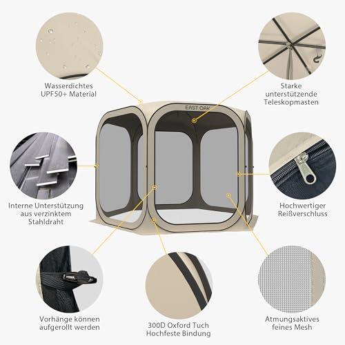 Modernes Design: Der Rahmen besteht aus strapazierfähigem 300D Oxford-Gewebe und einer rostfreien Stahlkonstruktion. Top unterstützt durch wasserfeste Glasfaser. (Das seitliche Netz ist nicht wasserdicht). Seitlich zu öffnende Vorhänge, die von innen und außen bedient werden können.