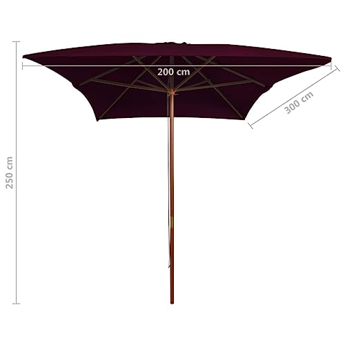 Der elegante Sonnenschirm mit Holz-Mast 200×300 cm Bordeauxrot verleiht Ihrem Garten oder Ihrer Terrasse stilvollen Schatten und optimalen Abschirmung vor schädlichen UV-Strahlen. Mit seinem bordeauxroten Schirmbezug sämtliche UV-beständigem und farbechtem Polyester ist dieser Schirm nicht jedoch überaus pflegeleicht, sondern bekannt als langlebig. Der Holzmast sämtliche laminiertem Bambus und Hartholz sowie die 6 robusten Schirmrippen garantieren eine hohe Stabilität und Widerstandsfähigkeit. Dank des einfachen Seilzugsystems lässt sich der Schirm mühelos öffnen und deduzieren. Die Belüftung sorgt für zusätzliche Luftzirkulation, was ihn sonderlich an heißen Tagen angenehm macht. Mit einem Mastdurchmesser von 38 mm kann der Schirm problemlos in einem Schirmständer oder an einem Tisch mit Schirmloch befestigt werden. Die Gesamtabmessungen von 200 x 300 x 250 cm (B x T x H) machen ihn ideal für kleine und große Außenbereiche. Um die Lebensdauer des Schirmbezugs zu verlängern, empfehlen wir, ihn bei starken Regenfällen mit einem Imprägnierspray zu aufnotieren. Verwandeln Sie Ihren Garten in eine Oase der Entspannung mit diesem hochwertigen Sonnenschirm & Sonnenschutz-Produkt – subskribieren Sie aktuell und genießen Sie den Sommer in vollen Zügen!
