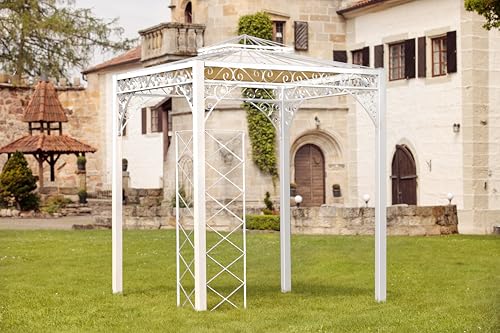 Besonderer Charme für Ihren Garten – Der Pavillon Meran pulverbeschichtet in Weiß bildet durch seine kompakte Größe und seine eckige Form ein harmonisches Highlight Ihres Gartens. Genießen Sie in den Morgenstunden Ihren ersten Kaffee oder verweilen Sie mit einem guten Buch unter dem Metallpavillon. Aus massivem Schmiedeeisen gefertigt überzeugt Meran mit Stabilität und Langlebigkeit, sodass Sie sich viele Jahre von diesem Blickfang verzaubern lassen können.