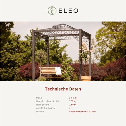 Größe und Montage – Der Pavillon Meran misst 2,08 m x 2,08 m. Die Gesamthöhe beträgt 2,69 m. Mit einem Gesamtgewicht von 175 kg ist der Pavillon besonders stabil. Die Montage können Sie selbst vornehmen, sie gelingt dank beiliegender Montageanleitung schnell und einfach. Idealerweise werden Sie von zwei weiteren Personen beim Aufbau des Pavillons unterstützt.