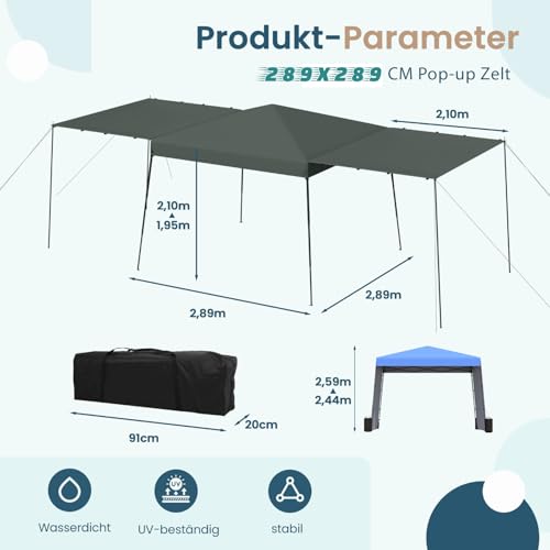EROMMY 3x3m Faltpavillon mit Doppelmarkisen – Wasserdichtes UV-50+ Campingzelt mit 4 Sandsäcken, transportabler Pop up-Pavillon für Garten, Camping & Festivals (Grau mit Grünstisch)
