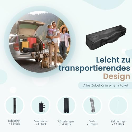 ✅ 【Komplettset】: Kein Installationswerkzeug erforderlich, kann schnell von einer Person in 1-2 Minuten aufgebaut werden. Das Zubehör umfasst eine 600D wasserdichte Tasche, 4 600D Sandsäcke, 12 Bodenpfähle auch 4 Sätze von winddichten Seilen, die leicht an Auto ausgestattet werden können.
