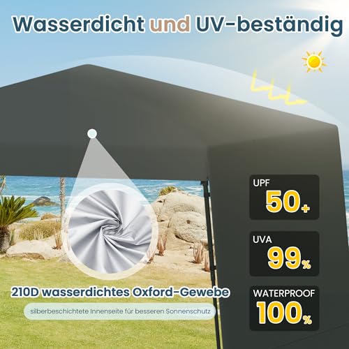 ✅ [Sonnenschutz + wasserdicht]: Diese Pop up-Pavillon ist aus 210D versilbertem Oxford-Gewebe mit UPE-Schicht hergestellt, die 99% der UV-Strahlen blockiert (UPF50+). An heißen Sommertagen reduziert die Silberbeschichtung auf der Innenseite die Temperatur.1000mm Wassersäule zertifiziert, um den Innenraum auch bei starkem Regen trocken zu halten.