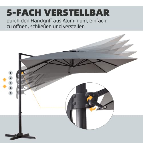 Der Schirm kann durch den Handkurbel sondern leichtes Aufspannen auf 5 Neigungswinkel eingestellt werden, und die Sonnenschutzwirkung wird durch die Bewegung des Sonnenwinkels nicht verringert. Veranstalten den Schirm je nach Sonneneinfall und ergänzen den gewünschten Sonnenschutzeffekt nach Ihren eigenen Vorlieben. Der Fußhebel des Kreuzfußes können den Schirm unkompliziert um 360 ° gedreht werden.