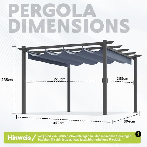 【GERÄUMIG UND VIELSEITIG】: Unsere 3x4x2,3M Pergola für den Außenbereich ist perfekt zum Entspannen, Essen und Faulenzen. Sie eignet sich perfekt für Hinterhöfe, Terrassen und Poolbereiche, ist langlebig und bereichert Ihr Outdoor-Erlebnis mit ihrer verstellbaren Markise.
