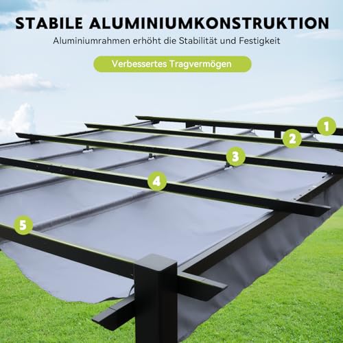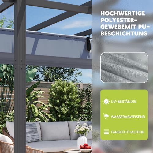 【AUFROLLBARE ÜBERDACHUNG】: Das verstellbare, einziehbare Dach dieser Pergola für den Außenbereich ermöglicht eine einfache Abart der Sonne und des Schattens. Es wird durch eine Handzugschnur und ein magnetisches Verschlusssystem gesteuert und bietet Abschirmung bei jedem Wetter. Die Markise kann je nach Bedarf ein- oder ausgefahren werden, um sich dem Wetter und den Aktivitäten im Freien anzupassen, unterdessen die sichere Konstruktion ein Verrutschen verhindert.