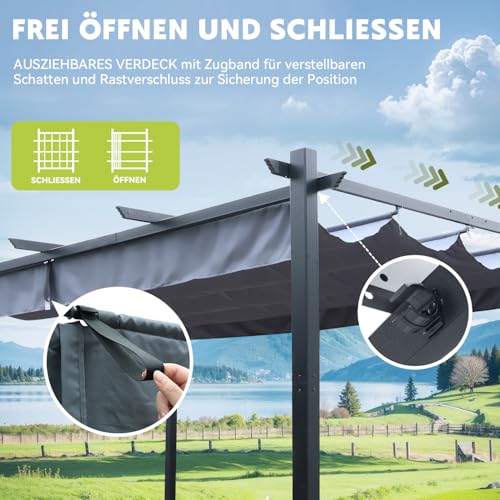 【AUFROLLBARE ÜBERDACHUNG】: Das verstellbare, einziehbare Dach dieser Pergola für den Außenbereich ermöglicht eine einfache Anpassung der Sonne und des Schattens. Es wird durch eine Handzugschnur und ein magnetisches Verschlusssystem gesteuert und bietet Schutz bei jedem Wetter. Die Markise kann je nach Bedarf ein- oder ausgefahren werden, um sich dem Wetter und den Aktivitäten im Freien anzupassen, während die sichere Konstruktion ein Verrutschen verhindert.