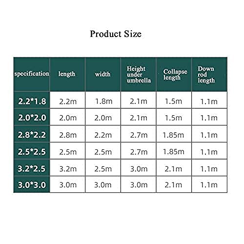 Die Größe dieses stilvollen Gartensonnenschirms beträgt 2,2 x 1,8 Meter (7,22 x 5,91 Fuß) und 2 x 2 Meter (6,56 x 6,56 Fuß) mit großen Schatten. Tief gelegen dem Sonnenschirm können Sie bequem plaudern oder angeln.