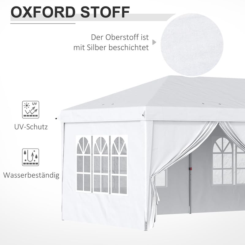 Pavillon Großer Abdeckungsraum:Pavillon 3x6m mit Seitenteilen und erhöhtem Dach, Der Innenraum des faltpavillon ist groß genug für mehr als 20 Personen und eignet sich somit perfekt für große Veranstaltungen, Partys oder Hochzeiten.Ausgezeichnete Materialien:3x6m wasserdicht sicher Faltpavillon die Gesamtheit 210D weißem, silberbeschichtetem, wasserdichtem Oxford-Stoff, und selbst der wasserdichte druck kann 2000 Pa erreichen, wodurch ultraviolette strahlen, die sowohl für sonnige als bekannt als für regnerische tage angebracht sind, effektiv widerstehen können.Der Zeltrahmen ist verdickt und verbessert, um ein leichtes Brechen zu umgehen.Abnehmbare Seitenwände:Faltpavillon3x6m mit Seitenteilen enthält 6 Seitenwände mit 2 Reißverschlüssen und 4 Fenstern. Sie können jedweder oder einige davon gleichzeitig verwenden Seitenteilen. So können Sie beispielsweise im Winter einen Pop up Faltpavillon mit allen Seitenwänden oder im Sommer einen ohne Seitenwände aufstellen.