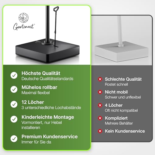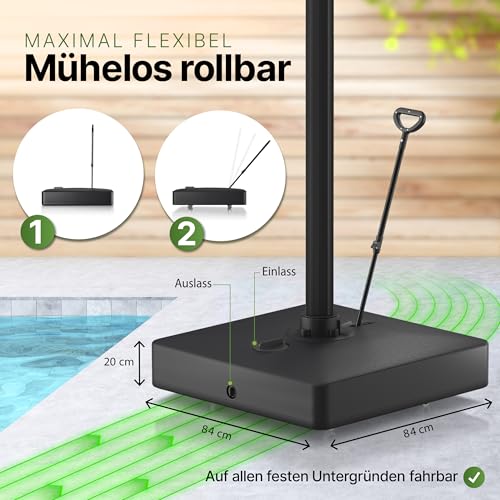 Sonnenschirmständer mit Rollen = Mobilität: Unser innovativer Sonnenschirmständer ist rollbar. Dank integrierter Räder und Hebelmechanismus wird eine mühelose Platzierung Ihres Sonnenschirms ermöglicht – ganz gleich, wo die Sonne steht. Genießen Sie jederzeit einen schattigen Ort am Gartentisch, Liegestuhl, Sandkasten oder einfach auf der Terrasse.