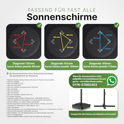 Nach Maß für fast alle Größen = Individualität: Unser Sonnenschirmständer für Ampelschirme wurde entworfen um auch große Ampelschirme auf feste Füße zu stellen. Von kompakten 100 cm bis hin zu großzügigen 400 cm Durchmesser – Sie können leistungsfähig sein, dass Ihr Ampelschirm leistungsfähig und gefestigt steht. Falls Sie sich für einen normalen Sonnenschirm wählen kann es sein, dass Sie zusätzlich noch ein Standrohr erwerben müssen.