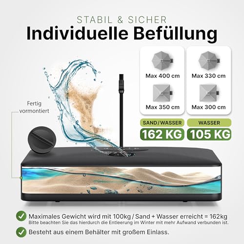 Befüllbarer Sonnenschirmständer = Adaptivität: Unser großer Sonnenschirmständer passt sich Ihren persönlichen Vorlieben an. Sie können ihn mit Wasser, Sand oder beidem befüllen. Das heißt der Sonnenschirmständer kann mit über 100kg befüllt werden. Das maximale Gesamtgewicht von 162kg wird mit Sand erreicht.