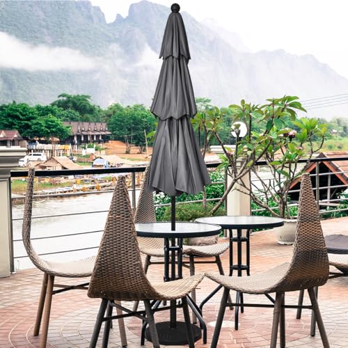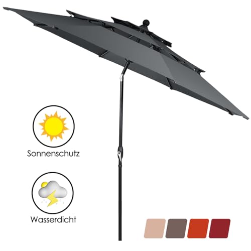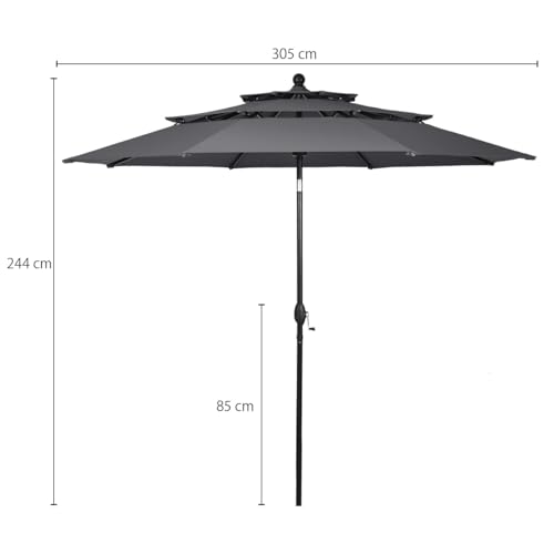Ob Öffnen, Verallgemeinern oder Neigen des Sonnenschirms, aus Funktionen lassen sich über die Handkurbel bedienen. Sie können den Sonnenschirm neigen, um Ihren Garten, Ihre Terrasse, Ihren Hof, Ihren Balkon oder Ihr Restaurant vielseitig zu am Ball bleiben. Unser Terrassenschirm hat doppelte Belüftungsöffnungen statt eine bessere Luftzirkulation, mehr Dauerhaftigkeit an windigen Tagen. Unser Sonnenschirm besteht die Gesamtheit strapazierfähigem Polyestergewebe mit hervorragender Spritzwasserbeständigkeit, Lichtechtheit und bietet guten UV-Abschirmung. Dieser Marktschirm wird mit einer Aluminiumstange und 8 stabilen Rippen geliefert, um eine stabile Unterstützung zu bieten und ihn auchgegen Wind und Rost zu machen.