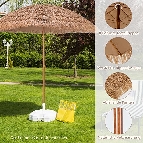 Unser strohgedeckter Sonnenschirm nimmt eine Stange aus Holzmaserung und natürliche Strohabdeckungen an, wodurch ein tropischer Farbton entsteht, der Ihnen ein echtes Hawaii-Feeling vermittelt. Er kann auch in Verbindung mit einem Terrassentisch-Set verwendet werden. Außerdem bietet der Sonnenschirm im hawaiianischen Stil Sonnenschutz und ist wasserdicht und langlebig. Dank der 8 stabilen Streben und des pulverbeschichteten Stahlrahmens ist der Tischschirm auch bei leichten Windverhältnissen erschütterungsfest genug. (Achtsamkeit: Bei starkem Wind bitte verstauen.) Genießen Sie Ihren Sommerurlaub mit unserem Strohschirm!