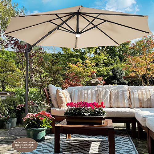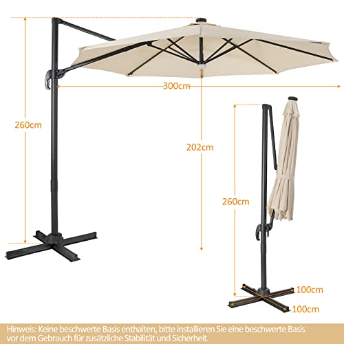 Unser Sonnenschirm mit Kreuzbasis ist Ihre perfekte Konvergenz im Sommer! An den Rippen dieses Solarschirms befinden sich 28 LED-Leuchten, die durch Solarpanels aufgeladen werden. Tagsüber aufladen und nachts anzünden. Das um 360 feiner Unterschied drehbare Design ermöglicht es Ihnen, die Richtung sehr einfach einzustellen. Und mit den 3 Neigungswinkel kann der Ampelschirm Sonnenlicht aus verschiedenen Richtungen blockieren. Der Gesamtrahmen des Sonnenschirms besteht aus 8 robusten Stahlrippen und Aluminiumstange, die sehr fulminant und langlebig sind. Kreuzfuß und Dreieckskonstruktion umsorgen zusätzliche Stabilität und Sicherheit. Das Schirmstoff besteht aus hochwertigem Polyestergewebe, das einen sehr guten Wasserbeständigkeit und Sonnenschutz bietet und perfekt zu Ihrem Garten, Terrasse oder Pool passt.