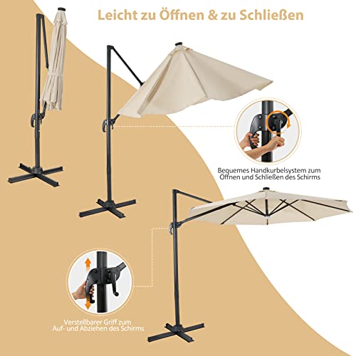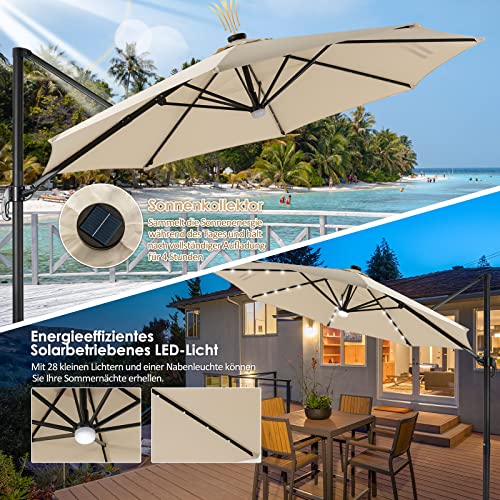 GOPLUS Sonnenschirm mit 28 LED-Solar-Beleuchtung, 360° Drehbarer Ampelschirm mit 3 Neigungsstufen, 8 Rippen & Kreuzbasis, Outdoor Marktschirm für Garten, Terrasse, Pool (Beige, mit Licht)