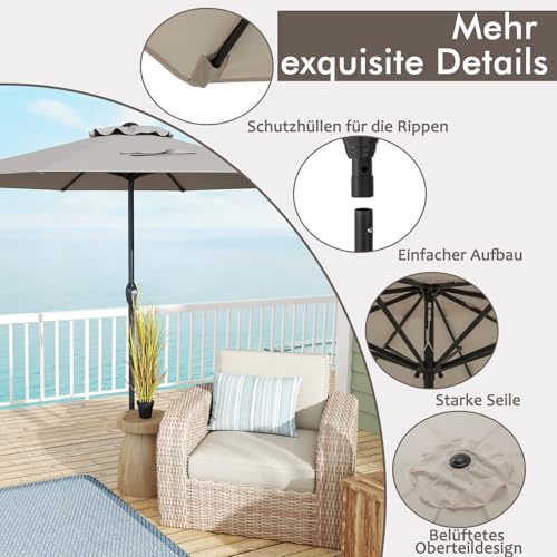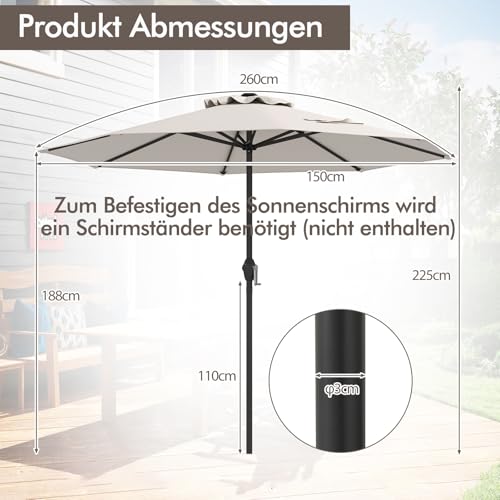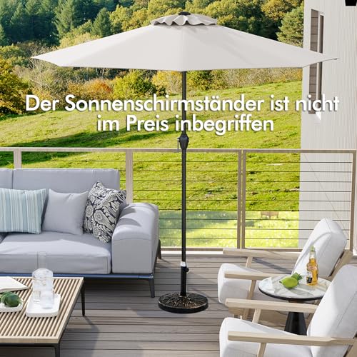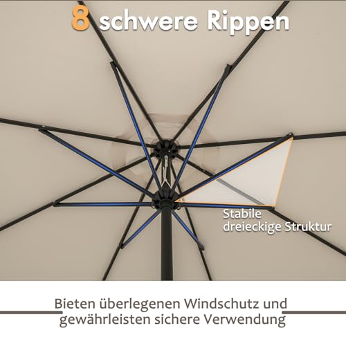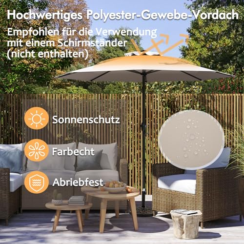 Unser Marktsonnenschirm ist allesamt hochwertigem Polyesterstoff gefertigt, der hervorragenden Sonnenschutz und Widerstandsfähigkeit gegenüber Abnutzung und Verblassen bietet. So bleibt Ihr Außenbereich alias über mehrere Saisons hinweg kühl und munter. Mit einem robusten, pulverbeschichteten Metallmast und 8 schweren Rippen steht unser Sonnenschirm hart im Nehmen und belastbar. Dessen ungeachtet ermöglicht der benutzerfreundliche Kurbelgriff eine schnelle und mühelose Bedienung, da ja das belüftete Bespannungsdesign die Luftzirkulation verbessert und das Risiko eines Umkippens verringert. Unsere Sonnenschirme benötigen zugunsten eine optimale Alterungsbeständigkeit einen Sockel (15 kg+, nicht enthalten).